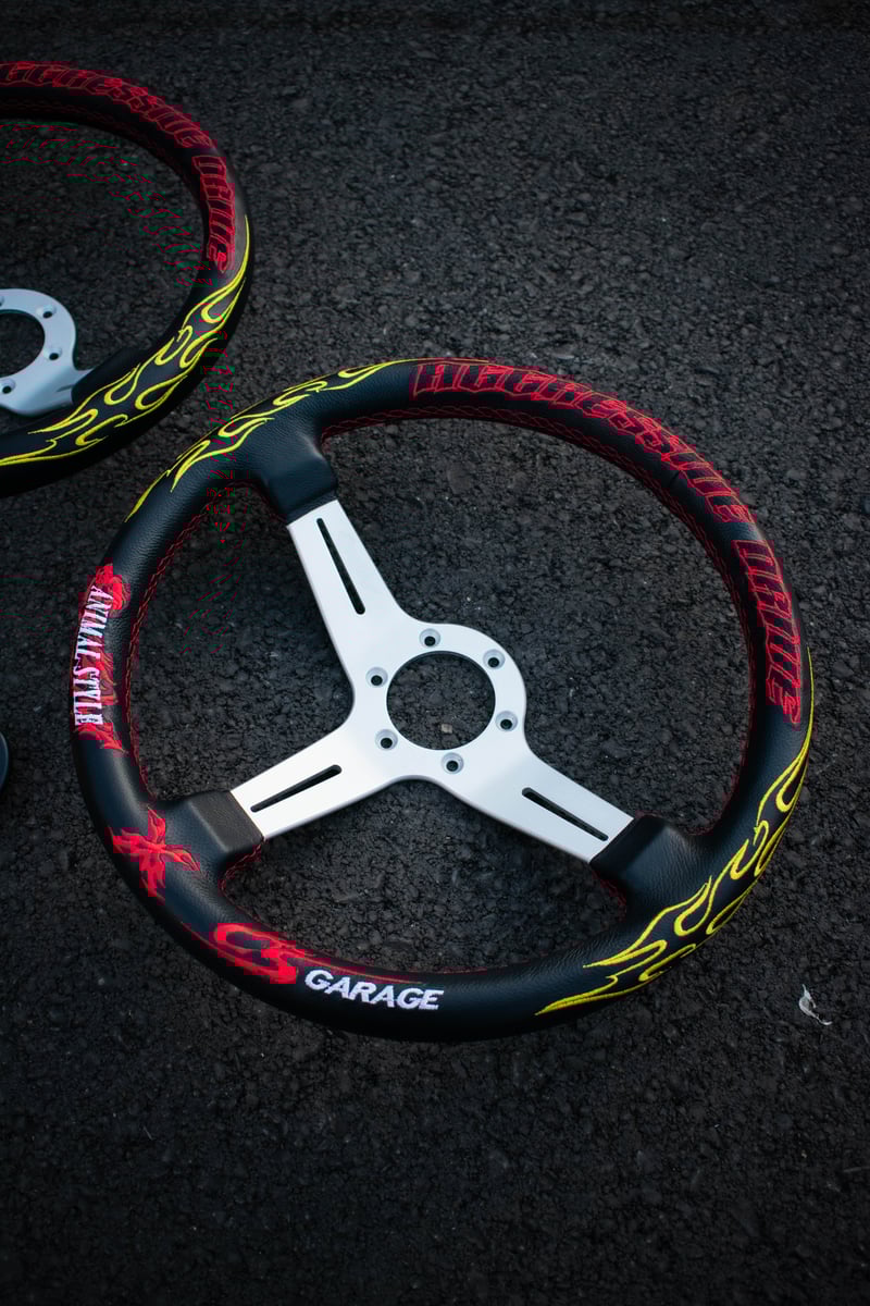 Originally a play on the vintage Okamoto Rubber Manufacturing Company “Safety Drive” stickers found on classic Japanese race cars of the ’70s and ’80s, Aggressive Drive flips the message to reflect the true spirit of drifting.